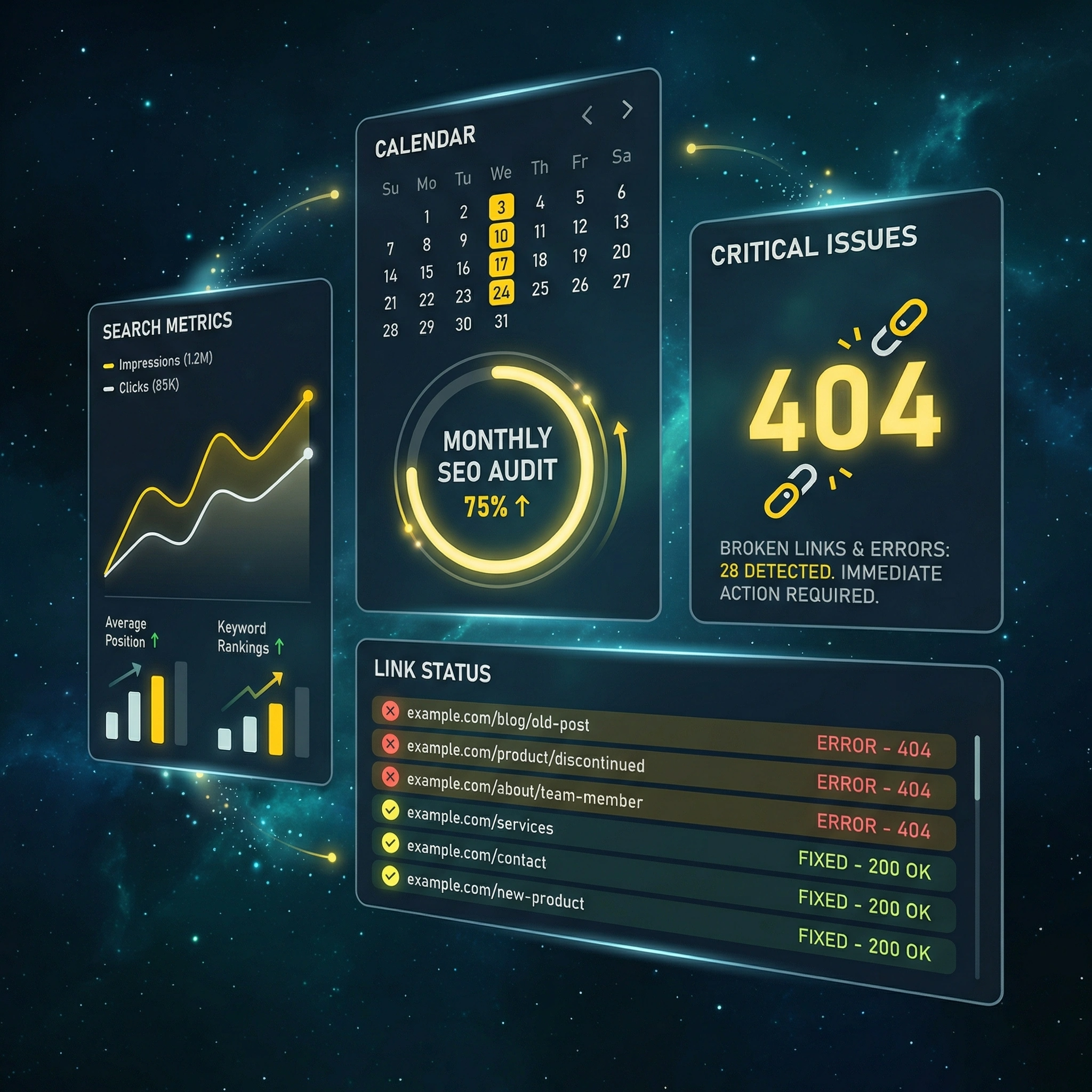 Monthly onsite SEO, 404, and broken link audits help ensure your website remains optimized for search performance and user experience. Each month, we review key SEO elements such as meta titles, descriptions, headings, and internal linking to maintain best practices and improve visibility. We also scan for 404 errors and broken links that can harm rankings or frustrate visitors, addressing issues promptly to keep navigation seamless and site health strong. This proactive approach ensures your website stays optimized, accessible, and ready to perform at its best in search results.