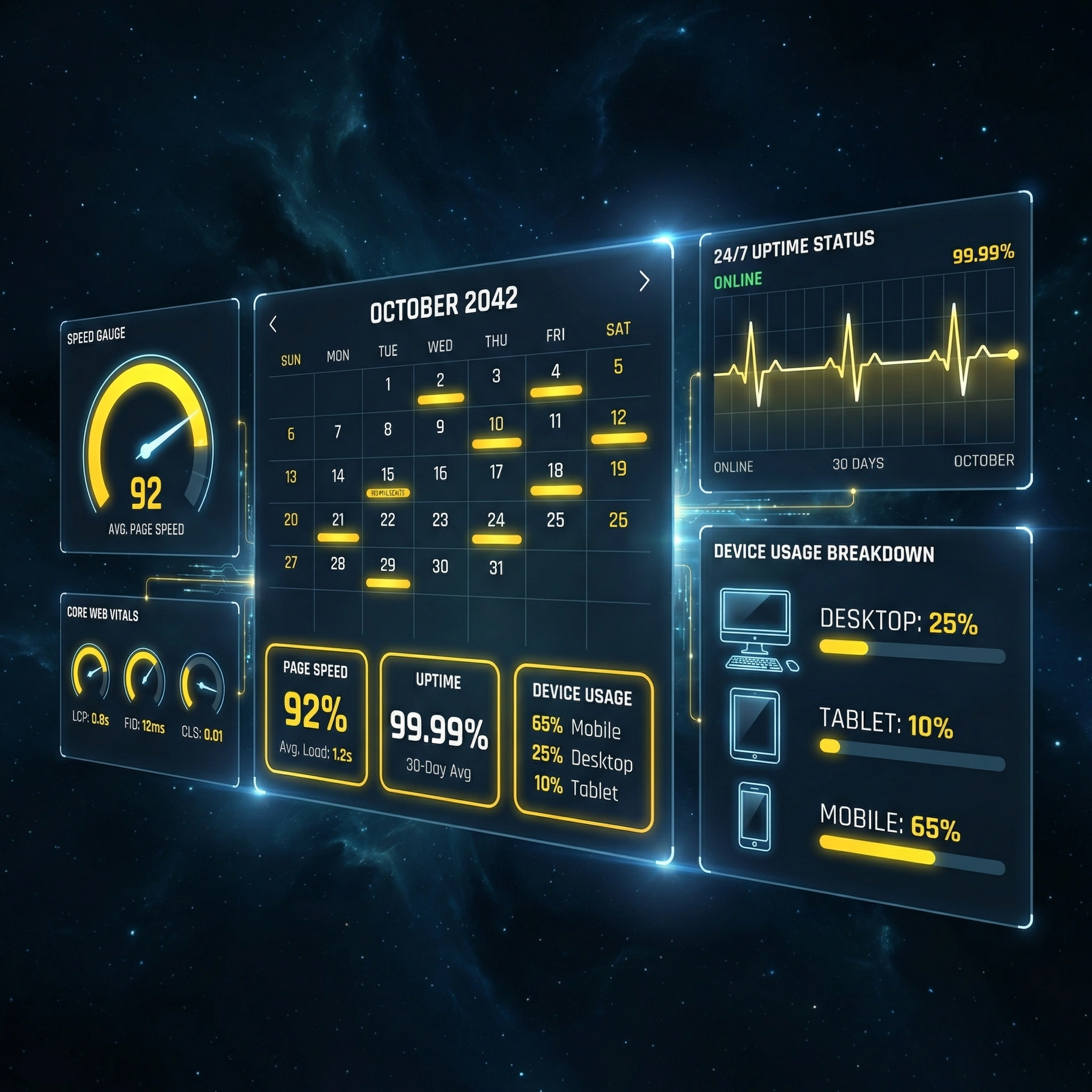 Monthly Page Speed, Uptime, and Device Usage reporting ensures your website continues to deliver a fast, reliable experience across all devices. Each month, we measure site loading times, monitor uptime performance, and track visitor activity by device type—desktop, tablet, and mobile—to identify trends and areas for optimization. By reviewing these metrics regularly, we can address performance bottlenecks, improve accessibility, and maintain a seamless experience for all users. This ongoing analysis helps keep your website efficient, consistent, and user-focused at every level.